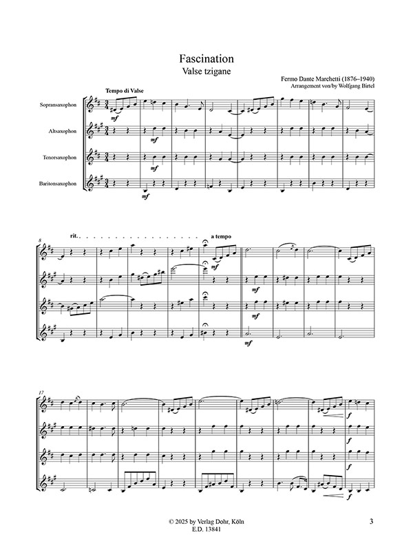Fascination. Valse tzigane für Saxophonquartett (SATBar) eingerichtet von Wolfgang Birtel Partitur und Stimmen M-2020-2841-4 |