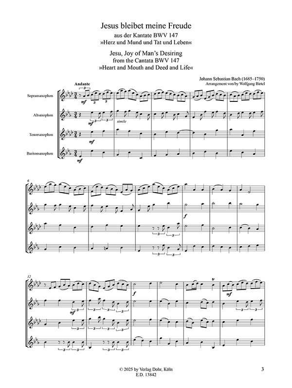 Jesus bleibet meine Freude BWV 147,10 für Saxophonquartett (SATBar) eingerichtet von Wolfgang Birtel Partitur und Stimmen M-2020-2842-1 |