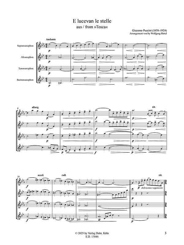 E lucevan le stelle (aus "Tosca") für Saxophonquartett (SATBar) eingerichtet von Wolfgang Birtel Partitur und Stimmen M-2020-2846-9 |
