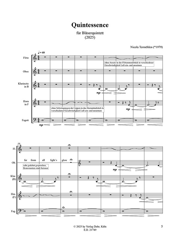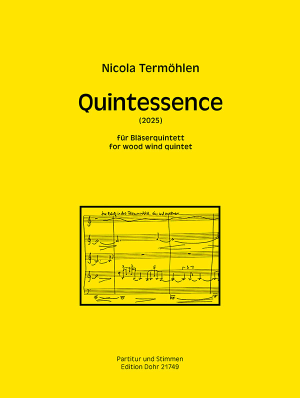 | Zum Werk"Quintessence" für  Bläserquintett  ist  eine Klangmeditation über Licht und Dunkelheit, über Nähe und Verborgenheit. Die Komposition entstand aus intensiver Auseinandersetzung mit Psalm 139,11–12 und bezieht ein von der Komponistin verfasstes Haiku (trad. jap. Gedichtsform) ein.Das Werk enthält erweiterte Spieltechniken, die den Klangraum öffnen und die Ausdruckskraft erweitern: Blasen nur mit Luft – direkt ins Instrument oder ins Mundstück –, gesprochene Passagen und auch Elemente des Sprechgesangs. Diese Klangfarben sind keine reinen Effekte sondern Ausdrucksträger für die Zwischentöne zwischen Dunkelheit und Licht, zwischen Wort und Ton.