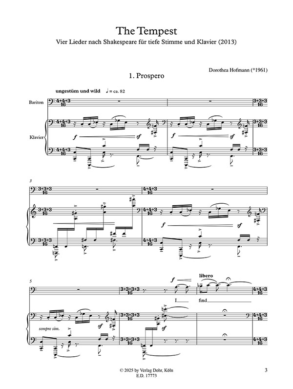 | Dorothea Hofmann | The Tempest (2013) Vier Lieder nach Shakespeare für tiefe Stimme und Klavier Spielpartitur M-2020-3773-7 |