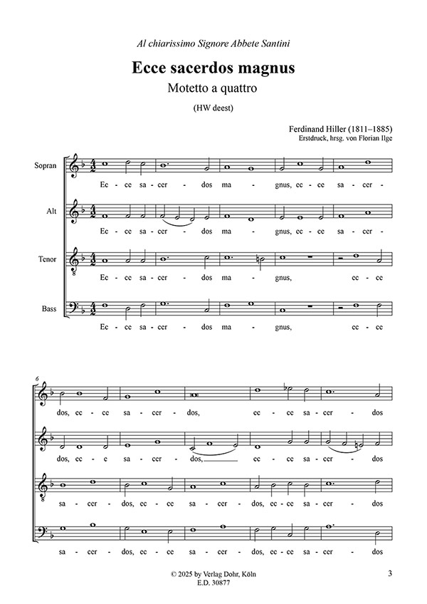 Zum WerkWährend seines Aufenthaltes in Rom in den Jahren 1841 und 1842 waren Hiller und seine Familie der Mittelpunkt der deutschen Künstlerkolonie in der "ewigen Stadt". Der vielseitig interessierte Komponist studierte hier die römische Vokalpolyphonie nach Giovanni Pierluigi da Palestrina und nahm auch an Proben der päpstlichen Kapelle teil. Seine Lehrer in dieser Zeit waren Giuseppe Baini (1775–1844), ein italienischer Musikhistoriker und Kirchenkomponist und Fortunato "Abbate" Santini (1777–1861), ein katholischer Geistlicher, Komponist und Musiksammler. Letzterer ist zugleich der Widmungsträger der vorliegenden Motette, die am 27. April 1842 in Rom vollendet wurde und hier nun erstmals im Druck vorliegt. (Florian Ilge) |